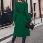 This Emerald Green Collar Neck Long Sleeve Tie-Waist Midi Dress features a sophisticated collar neckline with decorative buttons, bishop-style puffed sleeves, and a cinched waist tie for a flattering silhouette. The flowy A-line midi skirt in rich emerald green adds elegance and movement, perfect for office wear or semi-formal events. Made from lightweight, soft fabric, it’s versatile, breathable, and easy to style with boots or heels.