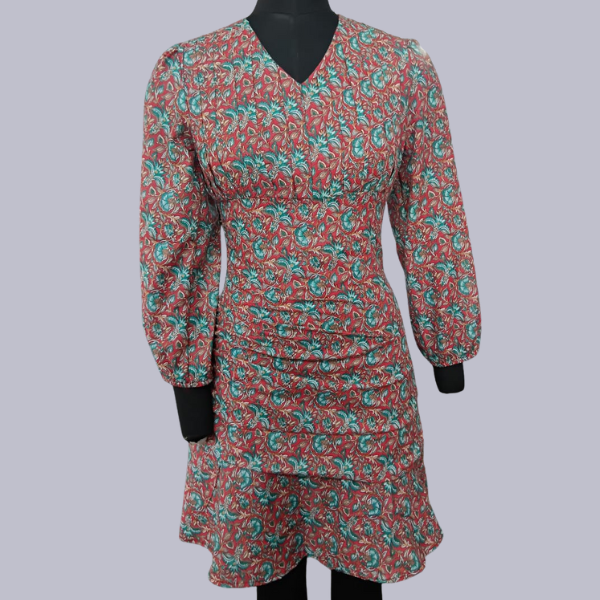 A deep V-neckline adds sophistication to the overall design. Soft puffed sleeves with gathered cuffs create a romantic touch. Together, these details blend traditional craftsmanship with modern styling.